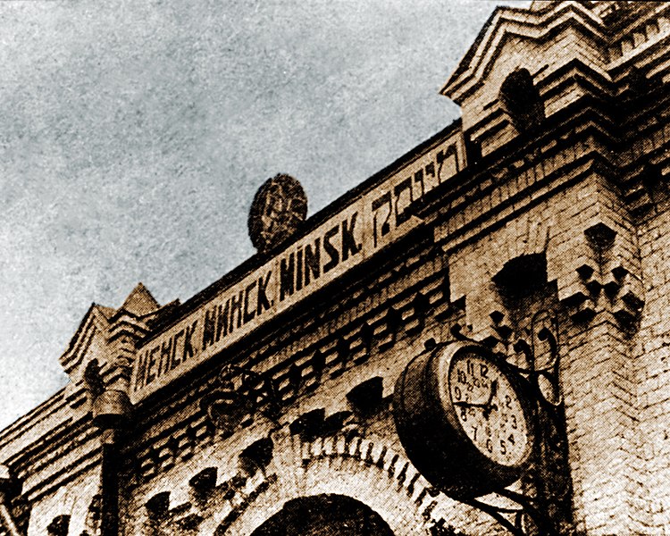 Inschrift des Namens der Hauptstadt in vier Sprachen am Bahnhofsgebäude in Minsk, Zwischenkriegszeit / Foto © Public domain