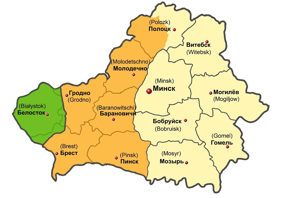 Karte der Belarusischen Sozialistischen Sowjetrepublik, 1946. Die ockerfarbenen Regionen waren inklusive Białystok von 1921 bis 1939 Teil der Zweiten Polnischen Republik. Unter deutscher Besatzung gehörte die von einer belarusischen Minderheit besiedelte und grün markierte Gegend um Białystok der Zivilverwaltung an. Nach dem polnisch-sowjetischen Abkommen von 1945 verblieb Białystok in der Volksrepublik Polen / Karte © Public domain