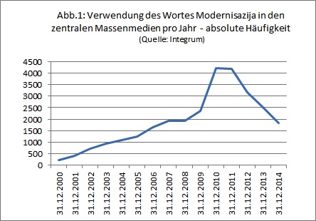 Mit der Rückkehr Putins in den Kreml endete der Modernisierungsdiskurs in Russland 2012 abrupt.6 „Modernisazija“ fand in den Reden des Präsidenten keine Erwähnung mehr und verschwand aus den Nachrichten (siehe Abb. 1). Über Skolkowo wurde nur noch in Zusammenhang mit Korruptionsskandalen berichtet. Die Modernisierungspartnerschaft zwischen Deutschland und Russland verwaiste zu einer leeren Worthülse. Zwar stiegen die deutsch-russischen Handelsumsätze, allerdings war die Folge nicht institutioneller Wandel sondern vielfach die Reproduktion des Status quo.7 Heute scheint Russland von Medwedews Modernisierungsambitionen weiter entfernt denn je.