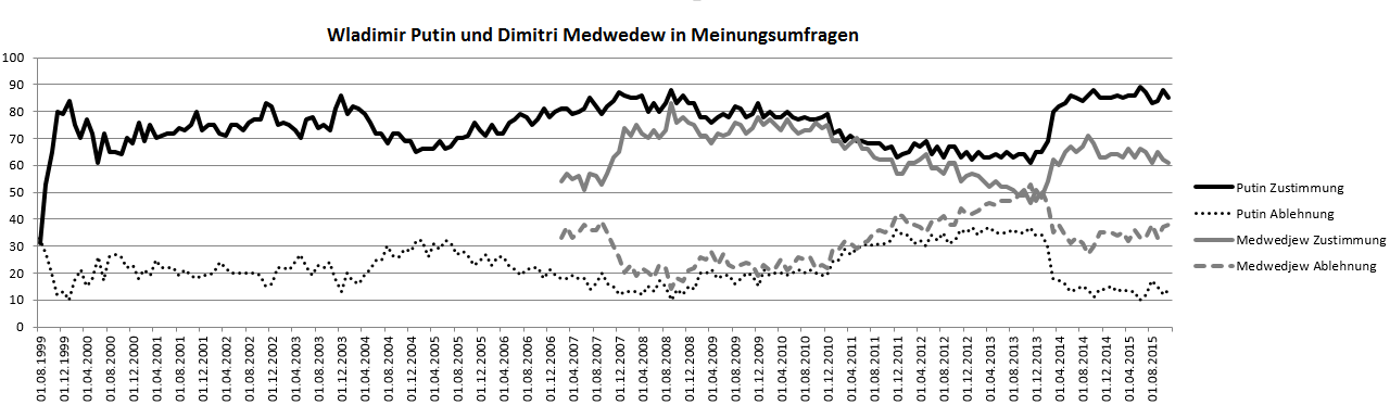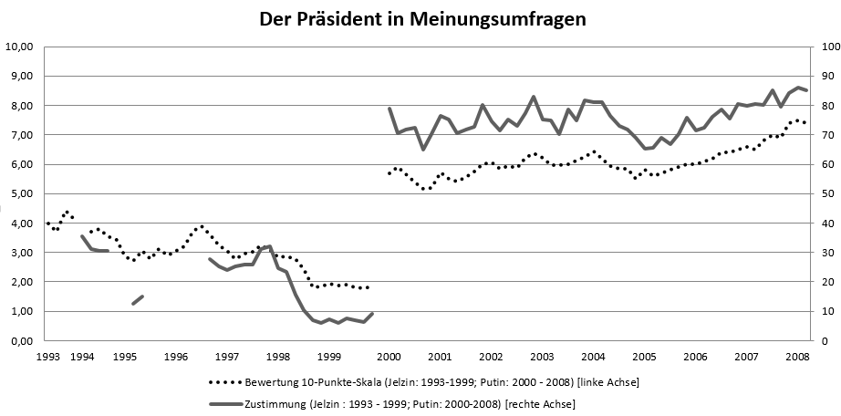 Auffällig ist, wie unterschiedlich die Präsidenten Jelzin in den 1990ern und Putin in den 2000ern von der Bevölkerung bewertet werden. Fand Jelzin im September 1991 noch bei 81 Prozent der Bevölkerung Zustimmung, so waren es am Ende seiner Amtszeit gerade einmal 8 Prozent, vor den Präsidentschaftswahlen 1996 lagen seine Werte lange unter denen des Kommunisten Gennadi Sjuganow. Noch als Premier hatte Wladimir Putin im August 1999 eine Zustimmung von 31 Prozent, im Januar 2000 als designierter Jelzin-Nachfolger waren es schon 84 Prozent. Seitdem liegen Putins Werte dauerhaft über 60 Prozent. Bemerkenswert ist zudem, dass er von 2008 bis 2012 selbst als Premierminister mehr Zustimmung erfuhr als der amtierende Präsident Dimitri Medwedew.