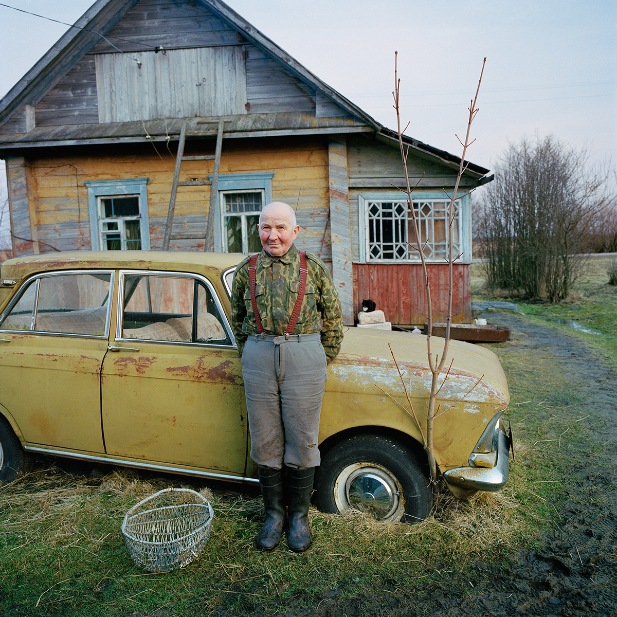 Витебская область, март 2014 года. Виктор живет один. Он ухаживает за домом, у него есть куры и петух. Весной 2014 года Виктор позирует во дворе своего дома у автомобиля, который надеется кому-нибудь продать. Виктор убежден, что банк, в котором он хранил свои сбережения в советские времена, обокрал его. Он безуспешно пишет жалобы в различные инстанции и министерства. Соседи считают, что он все придумывает / Фотография © Светлана Еркович.