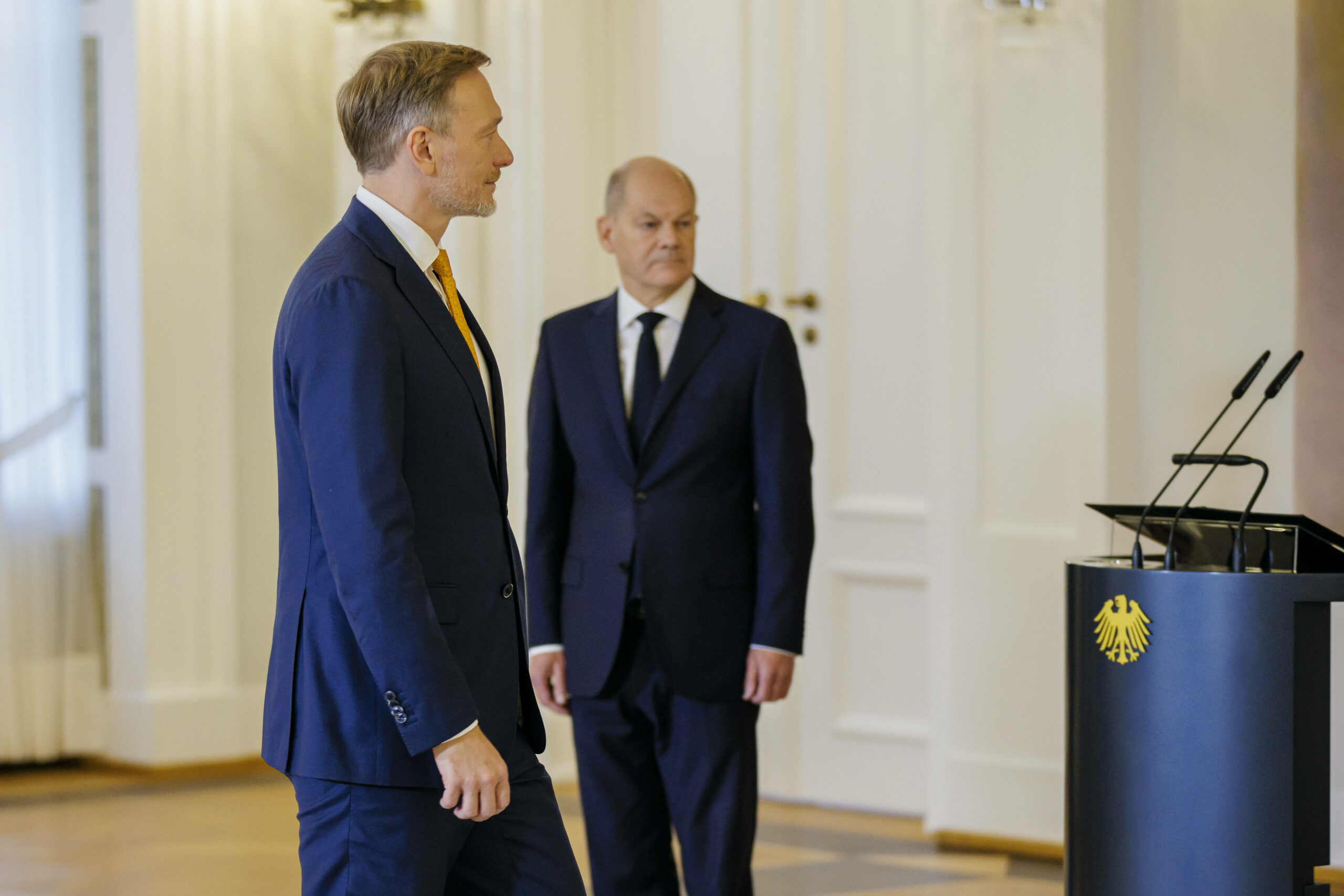 Кристиан Линднер (слева) и Олаф Шольц на церемонии отставки министра финансов и других министров от Свободной демократической партии в резиденции федерального президента Германии. Берлин, 7 ноября 2024 года // Фотография © Thomas Imo / IMAGO / photothek