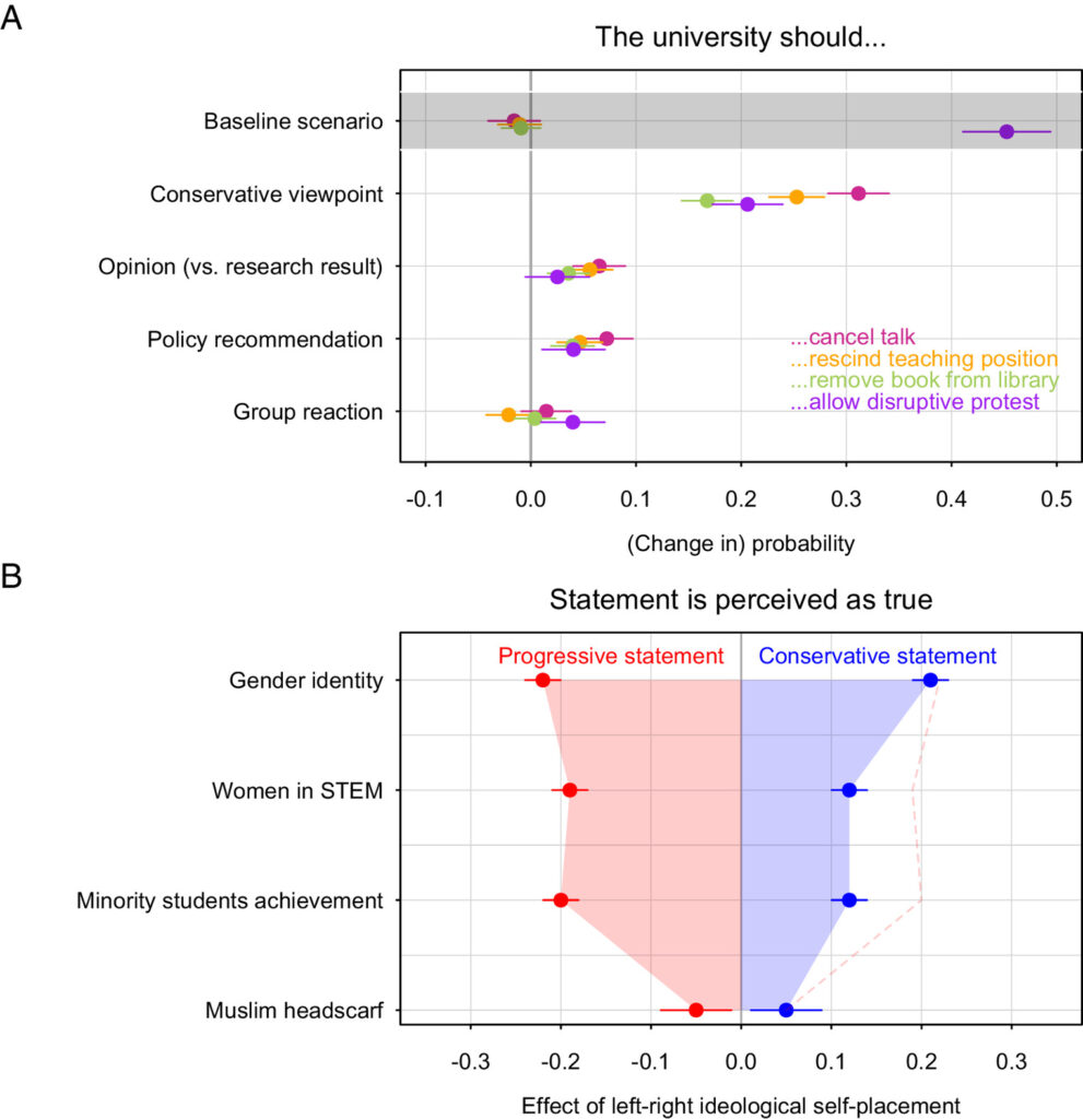 Все придуманные тезисы авторы классифицировали либо как «консервативные», либо как «прогрессистские». Они хотели понять, в каких случаях учащиеся чаще склонны требовать «отмены» (в буквальном смысле — отмены мероприятия, а также увольнения докладчика, изъятия его книг из библиотеки, разрешения на публичный протест против выступления). Базовый сценарий, с которым делалось сравнение: ученый выступает с «прогрессивным» тезизом, не дает никаких политических рекомендаций и не получает предварительных протестов со стороны университетских групп.