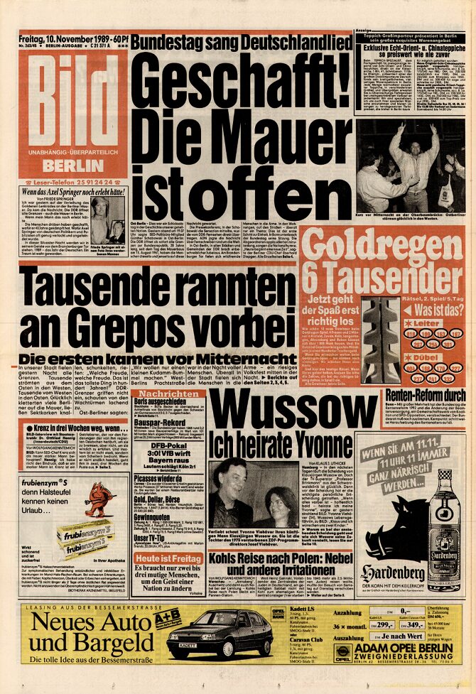 Бульварная газета «Bild» от 10 ноября 1989 года с заголовком: «Сделано! Стена открыта». Все газеты в ФРГ, подобно «Bild», 10 ноября 1989 года выносят новость об открытии стены на первую полосу: