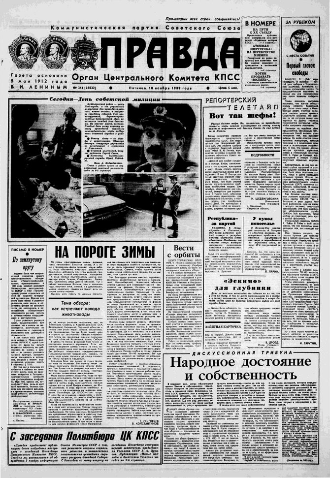 Первая полоса «Правды», партийного органа КПСС, на следующее утро, 10 ноября, никак не откликается на падение стены в далеком Берлине — как и другие передовицы советских газет. Заглавная тема «Правды» — подготовка животноводческих комбинатов к наступающей зиме.