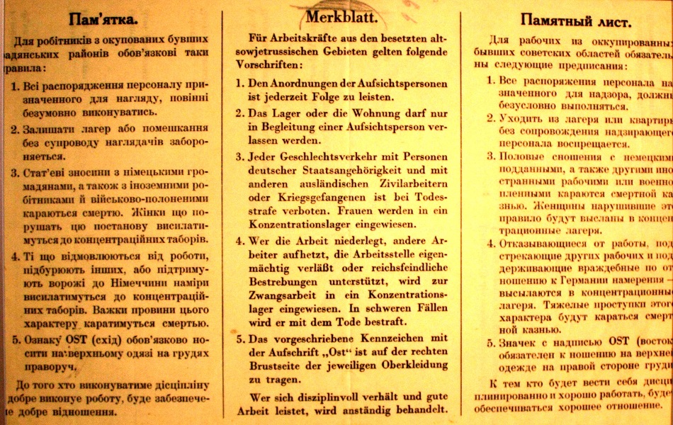 В 1943 году власти рейхскомиссариата Украина потребовали от всех жителей 1922–1925 годов рождения отбыть обязательную двухлетнюю трудовую повинность в рейхе. Приказом военного комиссара Киева по всей Украине были распространены плакаты, на которых говорилось: «Я жду, что все без исключения упомянутые лица явятся в означенное время для отправки».